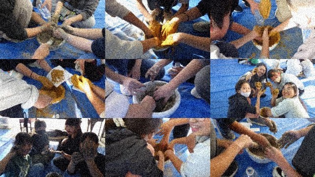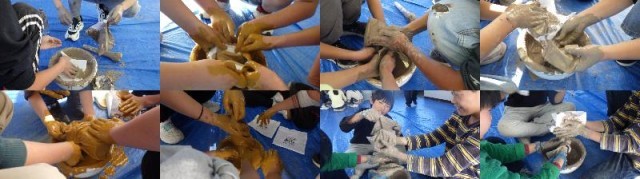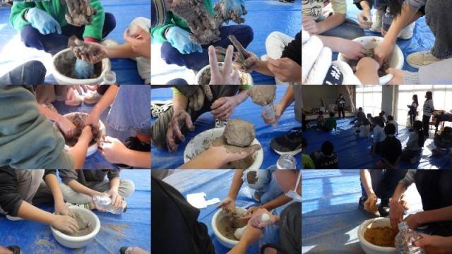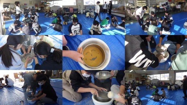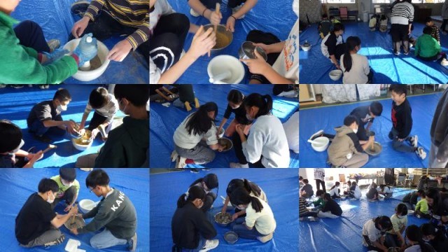 5年生では、毎年福祉の学習と郷土学習を兼ねて、地元の社会福祉協議会の施設を訪問させていただき、体験活動を実施しております。今年度は、11月28日の5年2組から始まり、12月5日の5年3組、そして本日5年1組が最終日を迎えました。「陶土染をやってみよう」にチャレンジしていました。土を砕いて粉にして、水を混ぜて粘土をつくります。さらに水を加えて泥にして、布を染めます。子どもたちは、白色と黄土色から好きな色を選んで取り組んでいました。とても楽しそうに、そして夢中になって取り組んでいました。