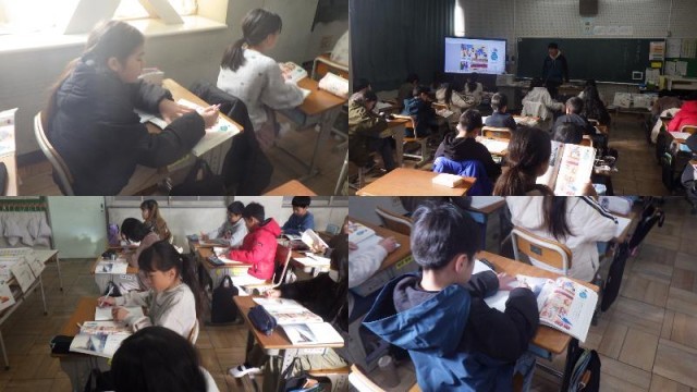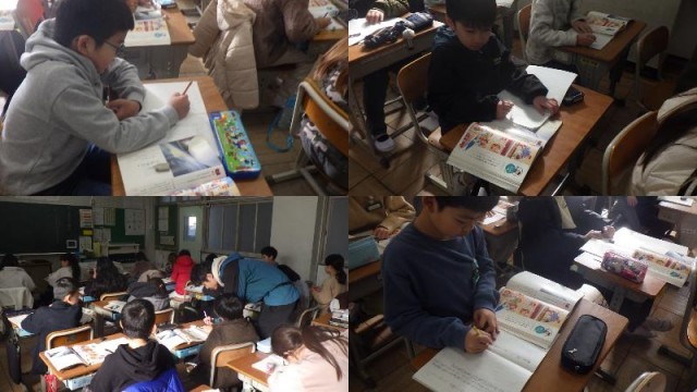 『漢字の広場5』の単元です。教科書の絵の中の言葉を使って、「どこで、どんな人が(誰が)、何をしているか」の短文作りに取り組んでいました。絵の中の漢字を使っていればOKとの条件で、送り仮名は変えてよいとのことなので、思い付いた文をどんどんノートに書くことができていました。