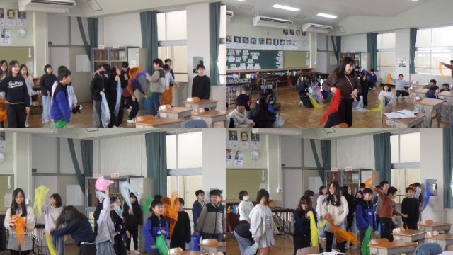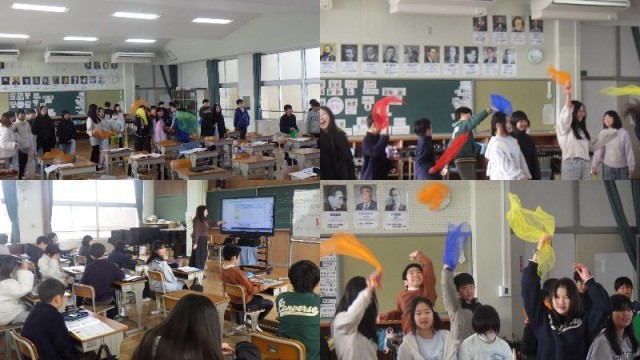 『音楽のききどころ』の単元です。めあては、「合いの手を見つけよう」で、『つるぎのまい』を聴いて、トロンボーンで合いの手をしているところを見つける授業です。スカーフを使い、合いの手の瞬間にスカーフを上げて表現します。始め・中・終わりのそれぞれで、どこに合いの手が入るのか、みんな曲にノリノリになりながらも、真剣に聞き分けようとしていました。