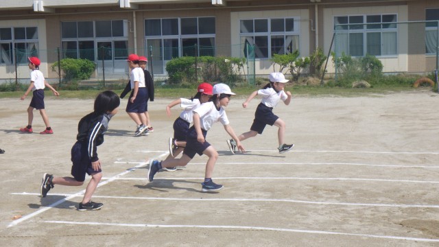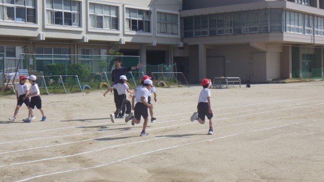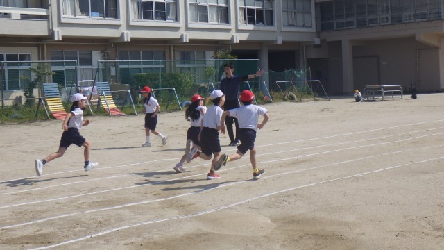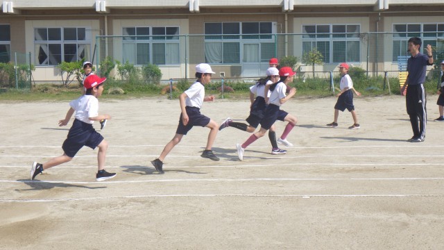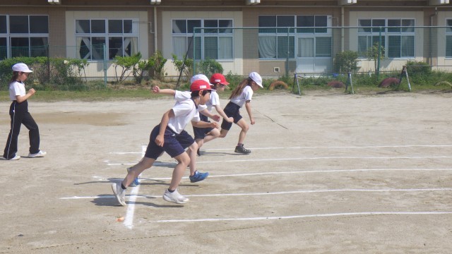 本日は体育シリーズです。まずは1時間目の4年生です。50m走のスタート練習に取り組んでいました。「位置について」の合図でしっかりと腰を据えて前傾姿勢を意識。合図と同時に地面を強く蹴り出す練習を繰り返しました。担任の先生のアドバスを真剣に聞く姿から、タイム向上への意欲が伝わってきました。