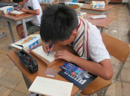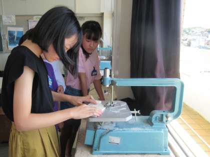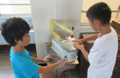6年生の図工は、「テープカッター作り」です。糸のこぎりで形を整えたり、彫刻刀でデザインを立体的に表現したりしています。