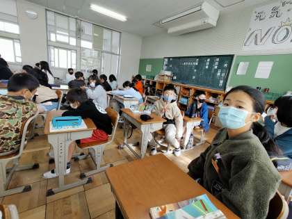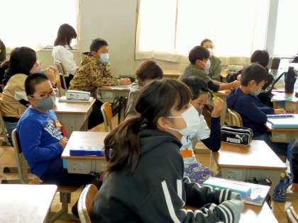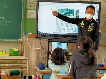 電子黒板に台風についての新聞記事や進路を映し出し、学習しています。台風がどこで発生するか、通り過ぎるとどうなるか、わかりやすかったね!