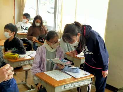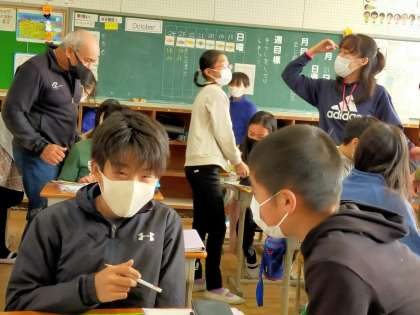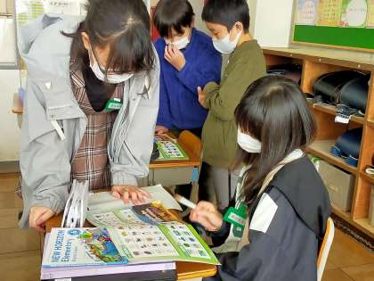 英語担当の先生とALTで英語の授業をすすめています。二人の先生が回りながら、一人ひとりと「生き物はどこに住んでいるか」を英語を使って話しています。先生が回ってくるまでは、友達同士で練習です。