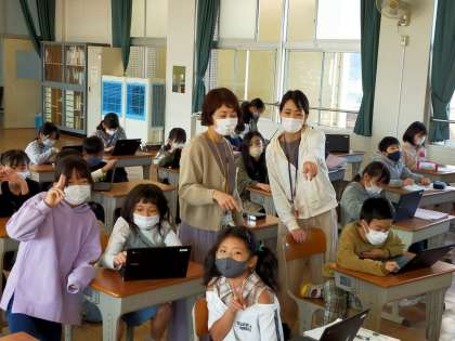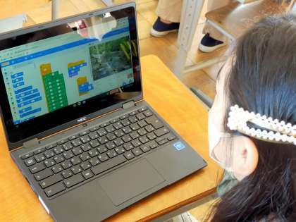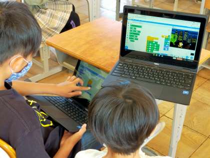 音楽の授業を、タブレットを使って行っています。プログラミングを使って音と動作を指示し、自分の思うような曲と動きを作り出しています。ICT支援員も一緒に子どもたちの指導にあたります。