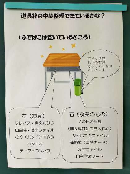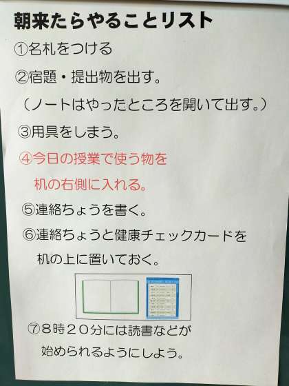 朝の黒板に、先生からのメッセージとともに、プリントが貼ってありました。水筒の置き場や朝やるべきことの順序などです。4月から徹底していても、状況によって変更する場合があります。また、おろそかになってしまうこともあります。当たり前のことをみんなで大切にしていき、みんなで気持よく生活していきたいですね。