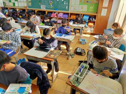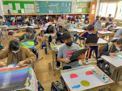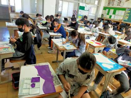 ブラシを使ったり刷毛を使ったりして、色の塗り方を工夫しています。下書きのときに「ここをグラデーションにする」と言っていた子の作品が、本当にきれいにできあがってきていました。それぞれが工夫を凝らして作品作りに取り組んでいます。