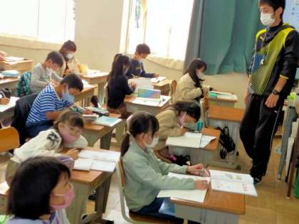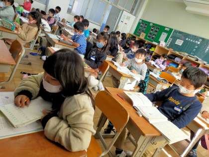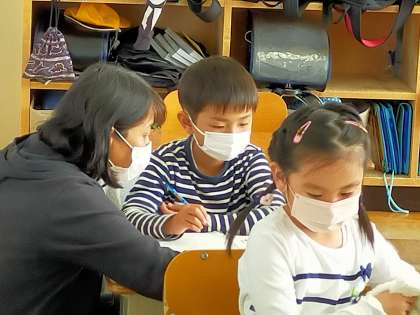 かけ算の練習問題に取り組んでいます。2年生では、かけ算をしっかり覚えなくてはいけません。先生も二人がかりで教えています。