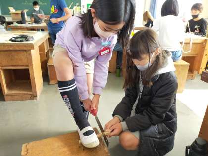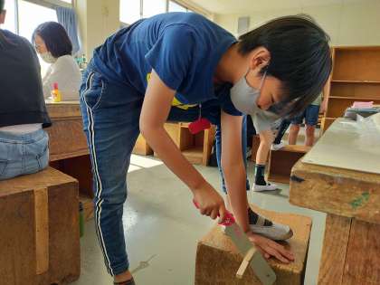 4年生の図工では、のこぎりを使って作品を作ります。今日はのこぎりで試し切りをしました。初めて使うという子も多く、恐がりながらでしたが、安全に気をつけて取り組みました。
