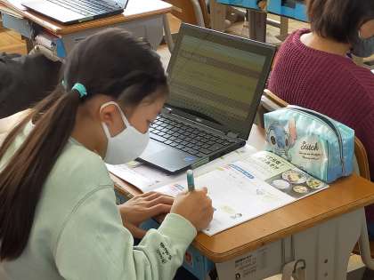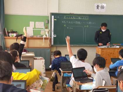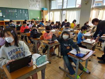 パソコンを使って米と味噌について調べ、学級全体で共有していきます。米や味噌には栄養がたっぷり含まれていることや加工しやすいことなどが、発言から出てきました!