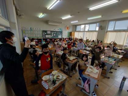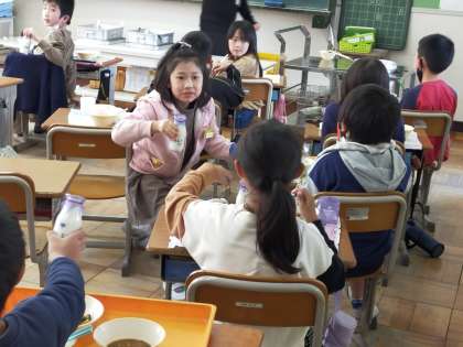 給食の時間に誕生日の子を祝い、牛乳で乾杯をしていました!3年3組では、今日が誕生日の子が3人もいました!おめでとう!