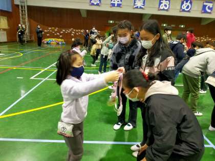1年生からメダルをかけてもらい、6年生はとても嬉しそうでした。