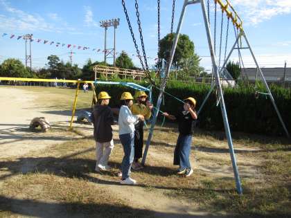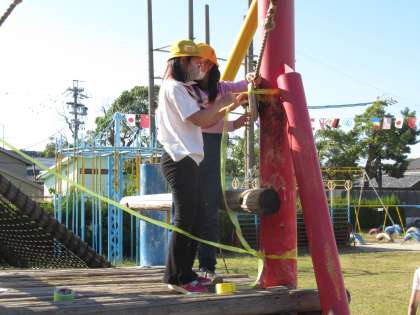 明日は遊具が使えないので、ひもを張ったり標示をしたりしています。