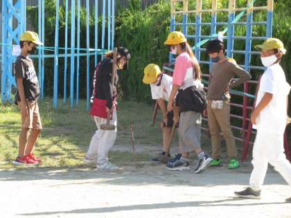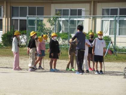観覧場所を仕切るロープ張りのため、くいを打ちます。