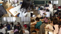 一生懸命描いています。描いた「人」の絵を先生に見てもらっています。