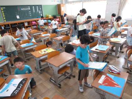 鑑賞の授業です。「夏休みの思い出」の描かれた友達の絵を熱心に見て、ワークシートに記入しています。