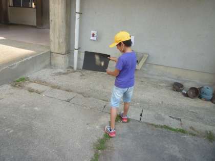 理科では「光とかがみ」の学習に入っています。今日は鏡に日光を当て、壁などに映し出しながら、「光の進み方」を調べました。壁や黒い画用紙に光を当て、距離を遠くにしたり、近づけたら、どのように映った光は違うか?などを実際にやってみて調べました。「真っ直ぐに光は進む」「遠くでは光が広がる」「遠いと映った光がうすくなる」「近くだと濃い」などに気づくことができました。次は「鏡に反射した光の、遠い近いでの暖かさはどうかな?」について予想し確かめていきます。