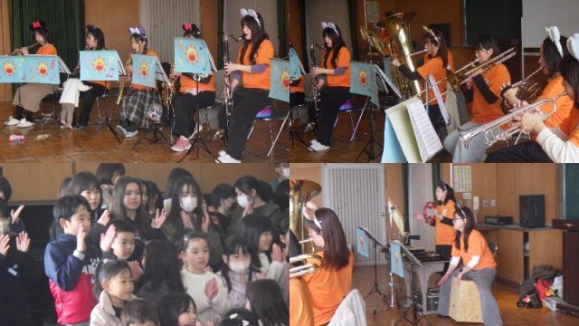本日の昼放課、「おひさまハーモニー」の皆様にお越しいただき、ミニコンサートが開催されました。会場の視聴覚室は超満員に。熱気あふれる中、誰もが一度は耳にしたことのある「みんなの知っている曲」が続き、子どもたちの手拍子や歌声が重なっていました。コンサート中盤では、教頭先生がトランペットをもって登場!会場はさらに大盛り上がりとなりました。プログラムが終わっても、拍手は鳴り止まず、会場から「アンコール!」「アンコール!」の大合唱。急遽アンコールも行われました。デジタル音源にはない、「生の演奏」の素晴らしさ・・・。おひさまハーモニーの皆様、心躍る素敵な時間を本当にありがとうございました。