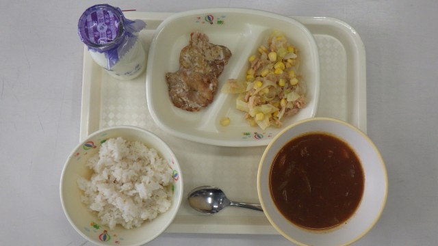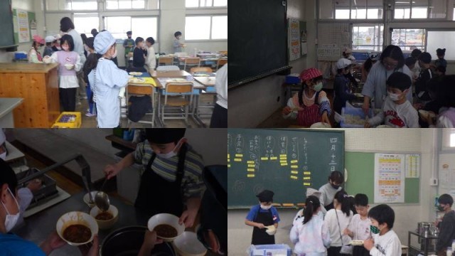 新年度初の給食は、麦ご飯・牛乳・ハヤシライス・とりにくのたつたあげ・ツナサラダでした。今年度から、給食当番服が、共用利用から各家庭で準備することになり、給食準備の景色も少し変わりました。
