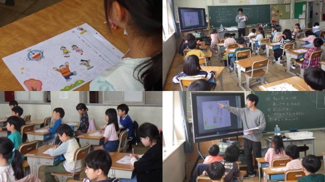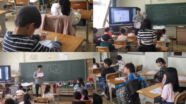 『大きさくらべ(2)』の単元で、「ばしょとりゲーム」をやっていました。取材者も、ゲームに参加することになりました。勝負ですので勝ちたいのですが、相手は1年生なので「忖度」なんて言葉も知らず・・・。取材者は全力のボロ負けでした。相手の児童は、丁寧にマスの数を数えて、自らの大勝利を確認!ゲームを楽しみながら、広さの比べ方をしっかり学習できました。