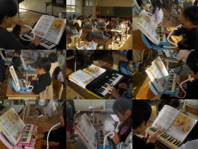 『めざせ 楽き名人(2)』の単元です。「きょくの かんじを 生かして えんそうしよう」の学習課題に取り組んでいました。「こぎつね」を鍵盤ハーモニカで一生懸命練習していました。山の中で、おしゃれをして遊んでいるようす。冬の山で遊ぶ物がなくて退屈しているようす。窮屈な穴の中で考えごとをしているようすなどをイメージして歌ったり、演奏する時間です。みんなとても楽しそうでした。