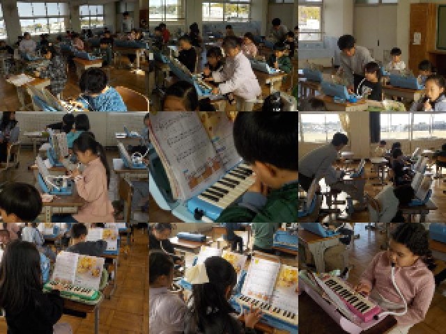 『めざせ 楽き名人(2)』の単元です。「きょくの かんじを 生かして えんそうしよう」の学習課題に取り組んでいました。「こぎつね」を鍵盤ハーモニカで一生懸命練習していました。山の中で、おしゃれをして遊んでいるようす。冬の山で遊ぶ物がなくて退屈しているようす。窮屈な穴の中で考えごとをしているようすなどをイメージして歌ったり、演奏する時間です。みんなとても楽しそうでした。