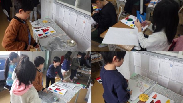 「たのしく うつして(絵)」の仕上げの時間です。画用紙の上に、自分で切ったいろいろな形の型紙を置いて、版をつくりました。友達のよいアイデアも参考に、さらに手を加えた子もいたようです。一人一人がアーティストのように工夫を凝らしていました。刷り上がると、とても満足そうな笑みを浮かべていました。表現する楽しさ、自分の作品に対する深い愛着が伝わってきました。