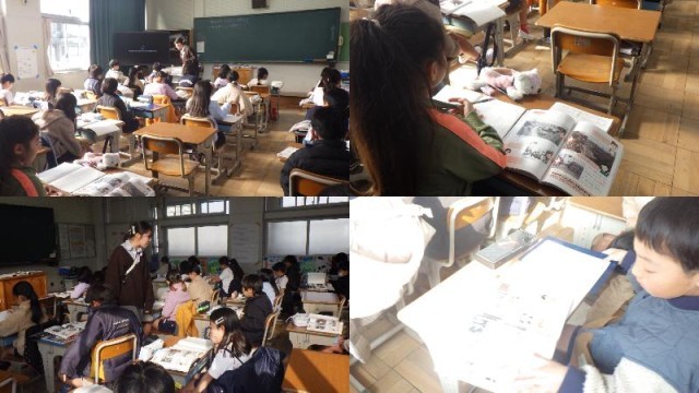 『市のようすとくらしのうつり変わり』の単元です。社会科副読本を使い、「一木橋」周辺、「山方橋」周辺の昭和前期と現在のようすを比較して、気がついたことをワークにまとめました。その後、副読本の写真を指さしながら、友達との情報交換も行っていました。