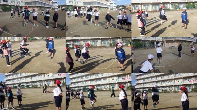 体育で大縄に挑戦中でした。ペア大縄大会まで頑張ってきただけあって、みんなとても上手に跳んでいました。縄を回す担当がとても大変ということで、撮影者も飛び入り参加し、大縄を一緒に楽しみました。