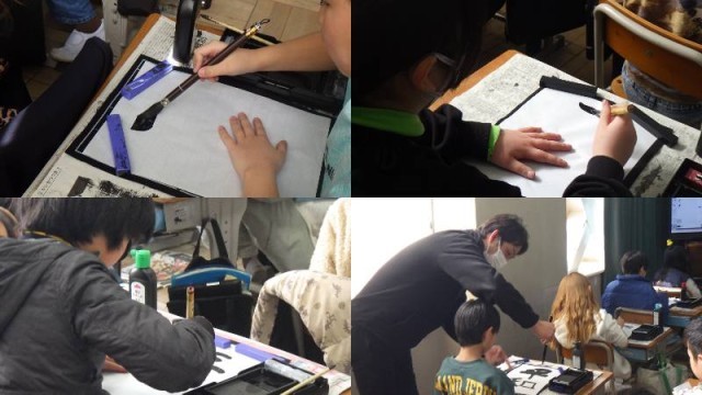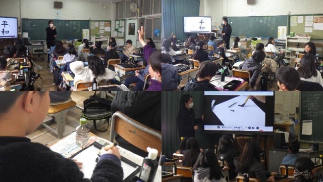 いよいよ「学習のまとめ」の時間となりました。最初に、この1年間で学習した数々の筆使いのポイントを振り返り、今年度最後の教材となる「平和」で、どう生かせるか確かめの時間をとりました。その後、各自のペースで練習に入りました。