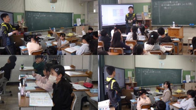 【大きな数のしくみ】の単元です。めあては、「大きな数を10倍した数や10でわった数を調べよう」です。ちょうど、「0が増えるってどういうこと?」を話し合っていました。一生懸命話し合った内容を、中にはどきどきしながら発表していた子もいましたが、担任の先生から「ナイスチャレンジ!」「子どもの意見って面白い!」と声をかけてもらい、発表できてよかったという安心した表情をみることができました。