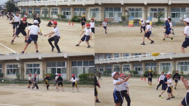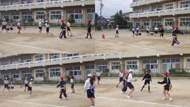 タグラグビーの試合をやっていました。第1時は「ルールを覚える」、第2時は「攻め方を考える」、そして本時は「点の取り方を考える」の時間であったようです。なるほど、前回見たときより、明らかに動きが変わっていましたので、チームでしっかり作戦を練ったのではないかと思います。声を掛け合い、協力してプレーする姿がとても印象的でした。