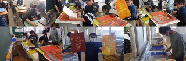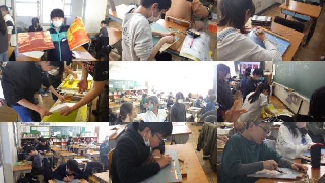 10月24日(金)に活動のようすをお伝えしましたが、その続きです。『版で広がるわたしの思い(絵)』の単元で、「色を考えてほり進めよう」の学習課題に取り組んでいました。黄→赤→青とインクの色を変えて順番に刷るのですが、黄にしたいところ、赤にしたいところと順番に考えながら彫り進めていきます。刷って、版を洗って、しっかり拭いて、次に色を残したいところを考えて掘り、また刷って、版を洗って・・・と続いていきます。先に実践した児童が失敗談を伝えたり、どうすればうまくいくか友達と話し合ったりしながら進めていました。