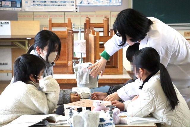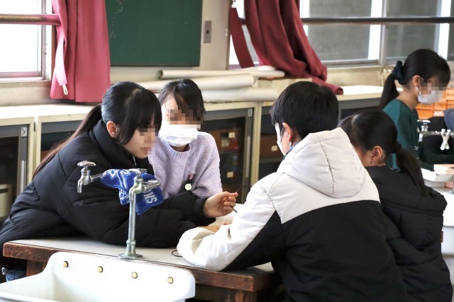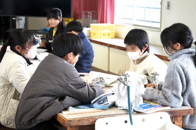 6年赤組は理科の学習です。手回し発電機を回して、電気をつくります。