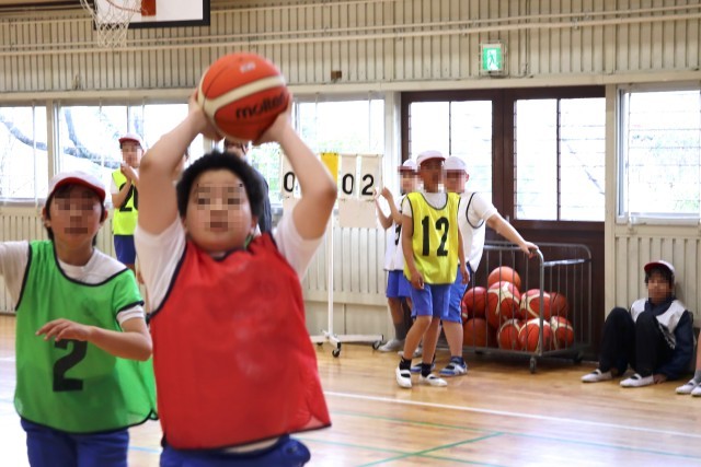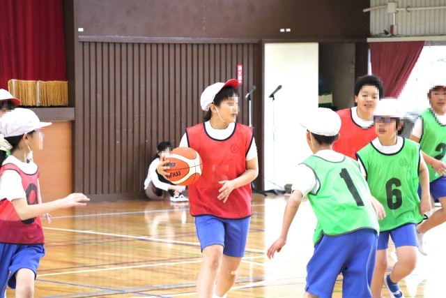5年白組は体育の学習です。バスケットボールをします。
