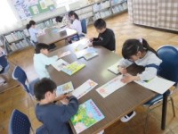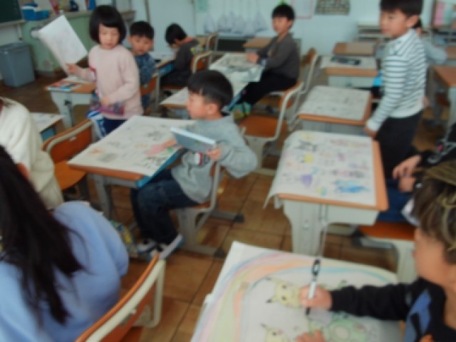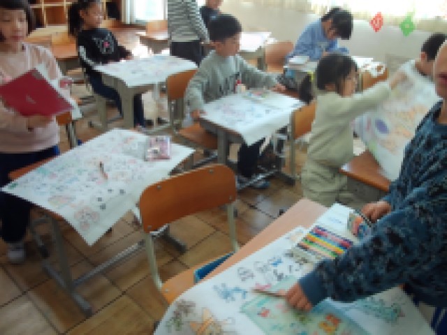 作品を持ち帰る大きなバッグに思い思いの絵を描いています。
