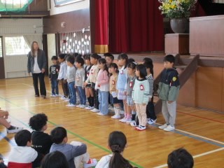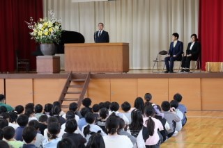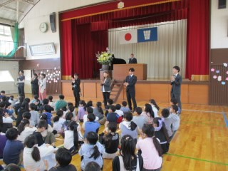 この4月から三和小学校に転入した先生を紹介しました。始業式の最後に担任の先生を発表しました。昨日入学した1年生も全校児童の前で元気よくあいさつすることができました。