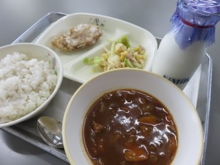 今年度最初の給食です。今日の献立は、麦ご飯、牛乳、ハヤシライス、鶏肉の竜田揚げ、ツナサラダです。常滑市では、今年度から給食当番の共用白衣にかわり、個人で用意したエプロンと三角巾等を基本とすることになりました。今日もおいしくいただきました。