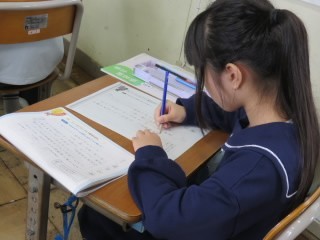 「文字の大きさや配列に気をつけて書こう」をテーマに、練習帳を使って硬筆で丁寧に文章を書く練習をします。鉛筆の持ち方や姿勢にも注意します。