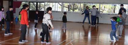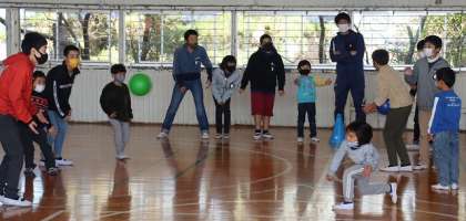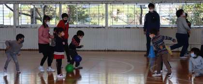 体育館で、1年生と6年生が、ドッジボールをして交流しました。