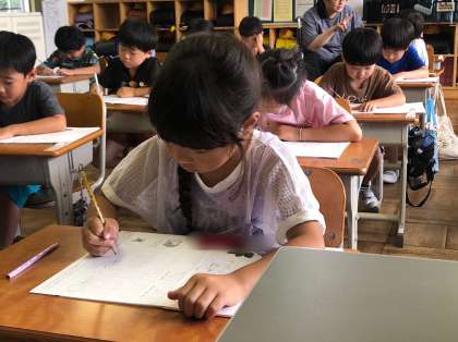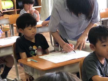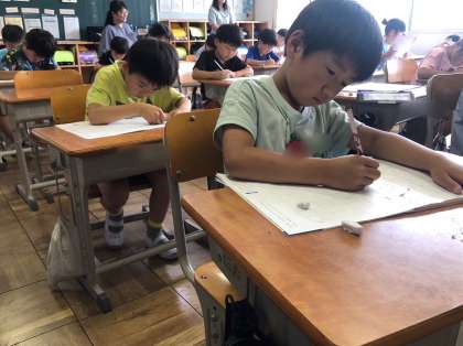1年生の書写です。ます目の中に正しく丁寧に書いています。大事な学習です。