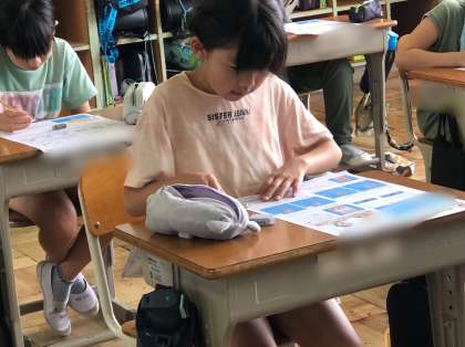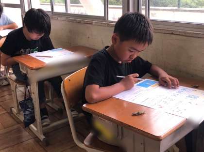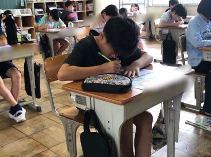 4年赤組の理科です。「電流のはたらき」の単元テストをしています。プールでの授業後ですが、集中して取り組んでいます。