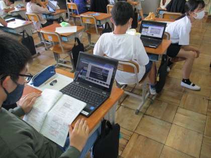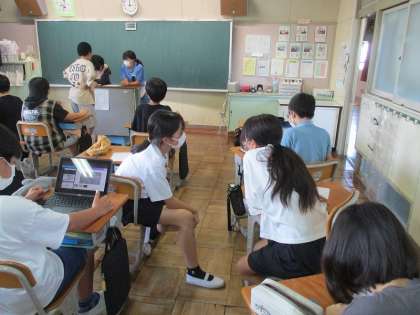 6年生の総合です。修学旅行についてのまとめを進めています。自分一人で黙々と進めたり、友達と意見を交わしたりしながらまとめています。