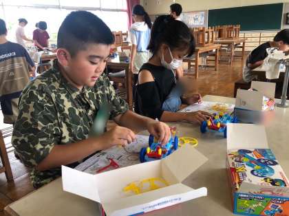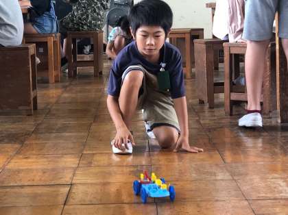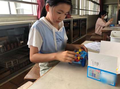 4年白組の理科です。モーターカーを作って、動かしています。うまくできたかな。そして、はたらきを理解できたかな。