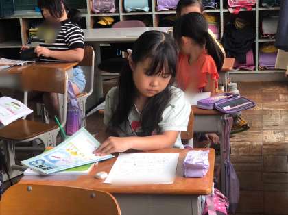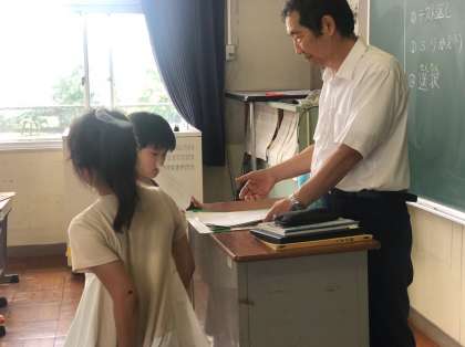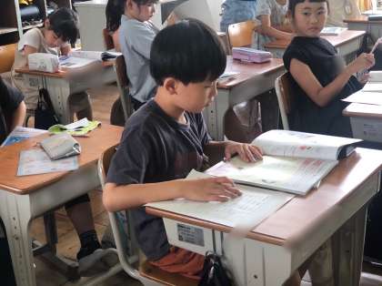 3年生の理科です。1学期の学習をふりかえりシートに記入しています。
