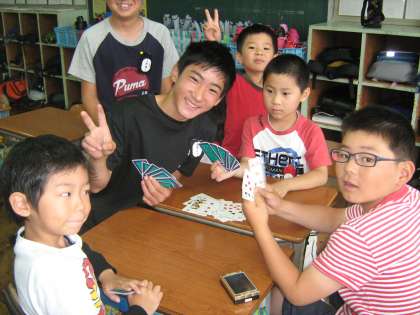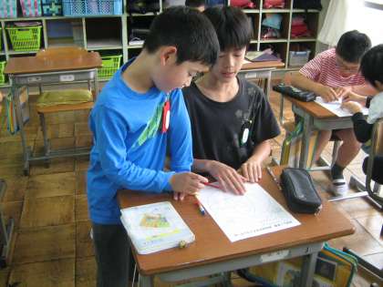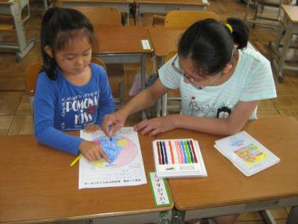6月8日月曜日,ペアで花壇コンクールの色塗りをしました。6年生がデザインした花壇を,1年生が色を塗りました。終わった後は,一緒にトランプをしたり本を読んだりして交流をしました。