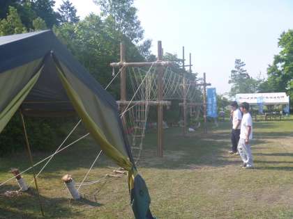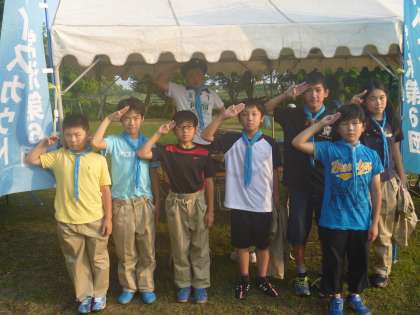 三和っ子や地域の皆さんの思いが通じ、朝から雲一つない快晴。いよいよ三和っ子フェスティバルが始まります。テーマは「交流」と「感謝」。楽しい各コーナーのあちこちで、三和っ子と地域の方との間に「こんにちは」「ありがとう」が響き合うことでしょう。そして、いつもの「豚汁」も振る舞われます。こちらも、感謝の気持ちで「いただきます」「ごちそうさま」を言いましょう。写真は、上から深夜に完成した「モンキーブリッジ」、その作成のお手伝いしたボーイスカウトのメンバー、三和っ子を迎えるPTA役員によるあいさつ運動。