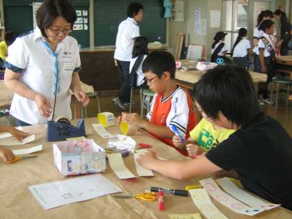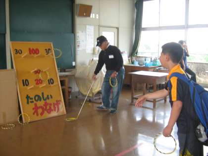 おまつりコーナーの様子です。上から久米コミュニティーの輪投げ、輪ゴム鉄砲、ガールスカウトの牛乳パックキュービクルパズルの写真です。