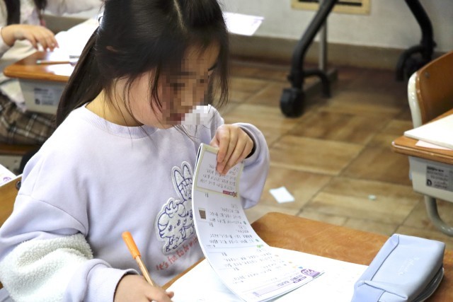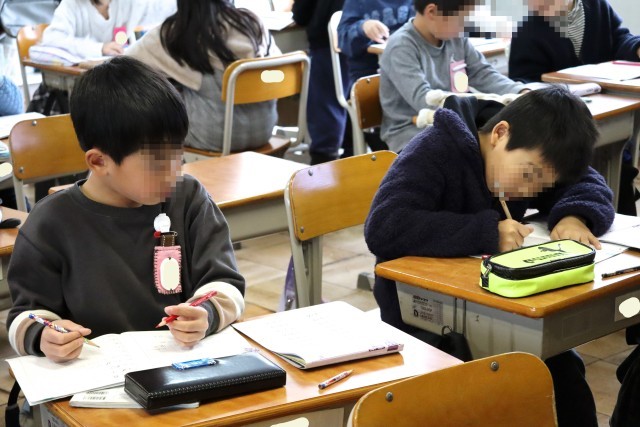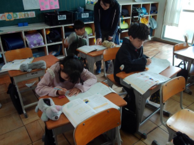 漢字ドリルで新出漢字を練習します。筆順や止め、はね、はらいなどに気をつけて書きます。
