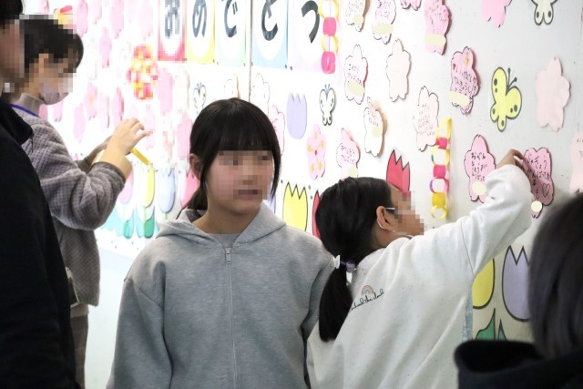 4年赤組は廊下の飾りつけをしています。廊下が華やかな雰囲気になります。