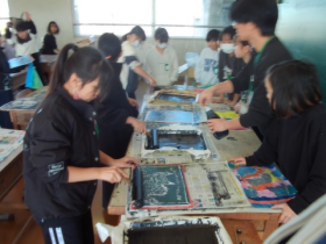 版画で「刷り」を行っています。